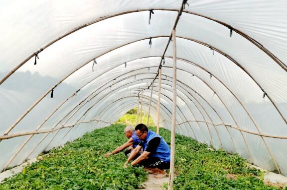 全州縣壽福村駐村工作隊(duì)員和農(nóng)戶正在香瓜大棚勞作。