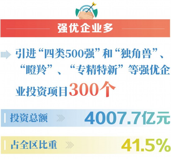 引進“四類500強”和“專精特新”等強優(yōu)企業(yè)投資項目300個,投資總額4007.7億元,占全區(qū)比重41.5%。