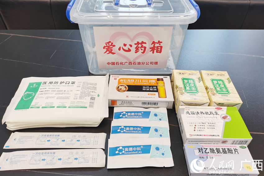 愛心藥箱包括相關藥品、檢測試劑及口罩。人民網記者 朱曉玲攝