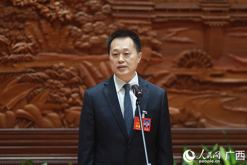 廣西人大代表,欽州市委常委,自貿(mào)區(qū)欽州港片區(qū)管委會(huì)常務(wù)副主任、黨工委副書記楊斌回答記者提問。人民網(wǎng)記者 吳明江攝