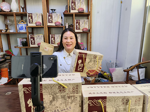 在兩人共同努力下,蘭舒平通過直播帶貨和短視頻推銷為自家產(chǎn)的牛臘巴打開了銷量?!斑@一年多,我在網(wǎng)上賣出了四千多單的牛臘巴,而且還有很多客人是看了我的視頻,再到店里和我交易,這也帶動了店里其他產(chǎn)品的銷量?!碧m舒平說,她現(xiàn)在每天都堅持發(fā)自己在店里或者在牛臘巴廠里日常忙碌的視頻,把家鄉(xiāng)的特產(chǎn)推銷出去,自己在店里也搭建了一個直播間,閑的時候就做直播帶貨。