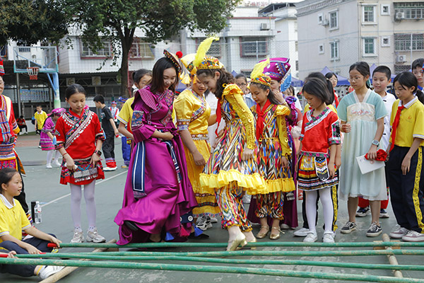師生一起跳竹竿舞。河池市金城江區(qū)第六小學(xué)供圖
