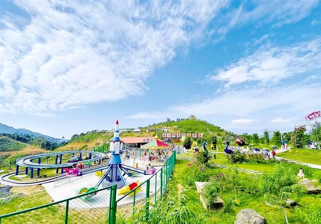 從村委大樓離開(kāi)后,沿著一旁的山路蜿蜒而上,進(jìn)入了當(dāng)?shù)赜忻慕鸲穾X生態(tài)旅游度假區(qū)。該景區(qū)由石榴村鄉(xiāng)賢陳超德經(jīng)營(yíng),占地面積243.5公頃,種植大面積的櫻花、木棉花、風(fēng)鈴花,設(shè)置有各類植物園、假山?jīng)鐾?、游?lè)場(chǎng)等。
