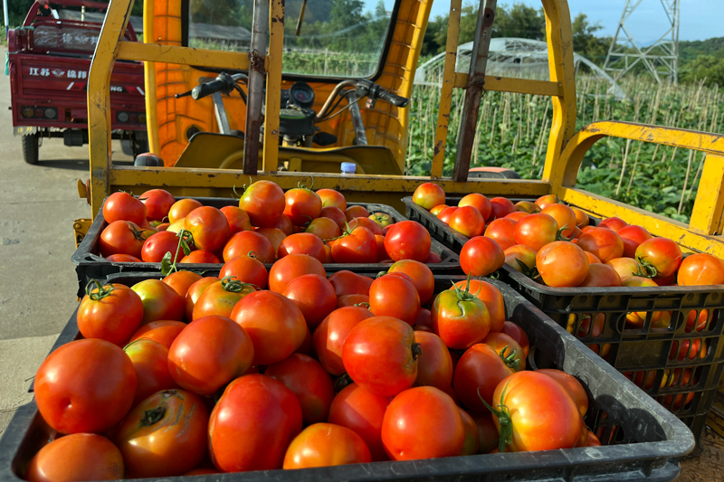 近日,走進(jìn)全州縣全州鎮(zhèn)集才社區(qū)排樓邊村西紅柿種植基地,郁郁蔥蔥的西紅柿藤蔓連成一片,田地里,一人多高的西紅柿植株有序排列,碧綠的藤蔓上掛滿了一顆顆圓潤飽滿的西紅柿。一大早,菜農(nóng)們在田里忙碌,采摘、分揀、裝筐、搬運(yùn),一派熱火朝天的景象。