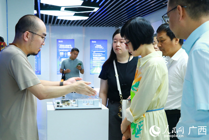 采訪團在西部陸海新通道南寧國際鐵路港展廳內(nèi)采訪。人民網(wǎng) 嚴立政攝