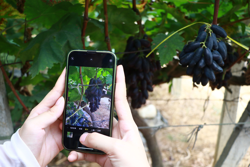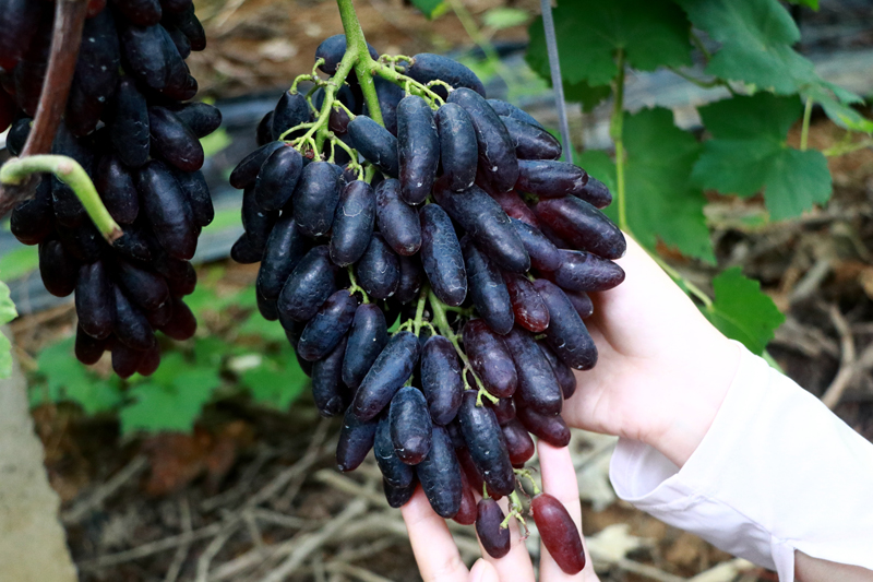 “藍(lán)寶石葡萄整體呈黑藍(lán)色,成熟后果實(shí)外表會(huì)帶上一層薄薄的‘白霜’,但這并不是農(nóng)藥的殘留,而是葡萄健康標(biāo)志的‘果粉’?!痹摶刎?fù)責(zé)人韋吉冰介紹,每當(dāng)夜幕降臨月光灑在葡萄上時(shí),葡萄就如寶石般發(fā)出光芒,因此藍(lán)寶石葡萄也被稱為“月光之淚”。