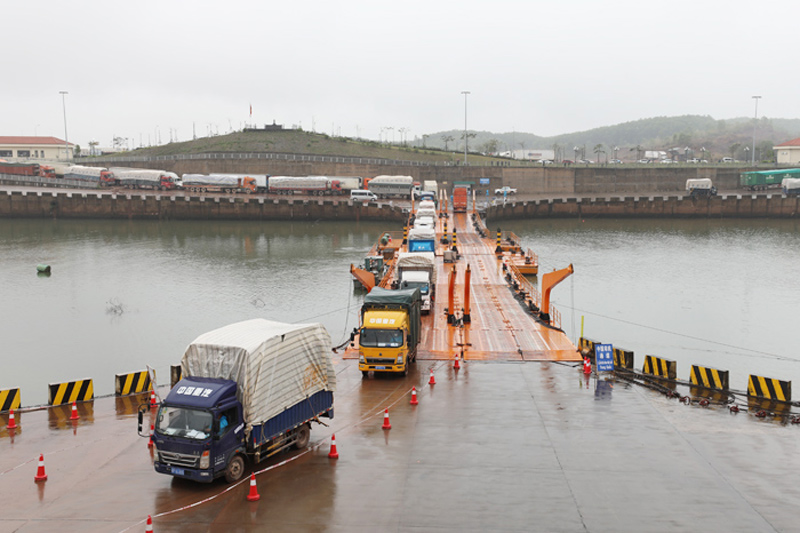 貨車相繼通過東興互市貿(mào)易區(qū)浮橋。東興市融媒體中心供圖