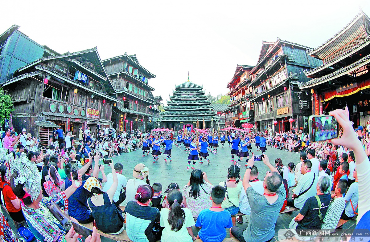 10月3日,眾多游客在三江侗族自治縣林溪鎮(zhèn)程陽八寨景區(qū)賞秋色、品侗宴、體驗民族風情。龔普康 梁秀明 攝