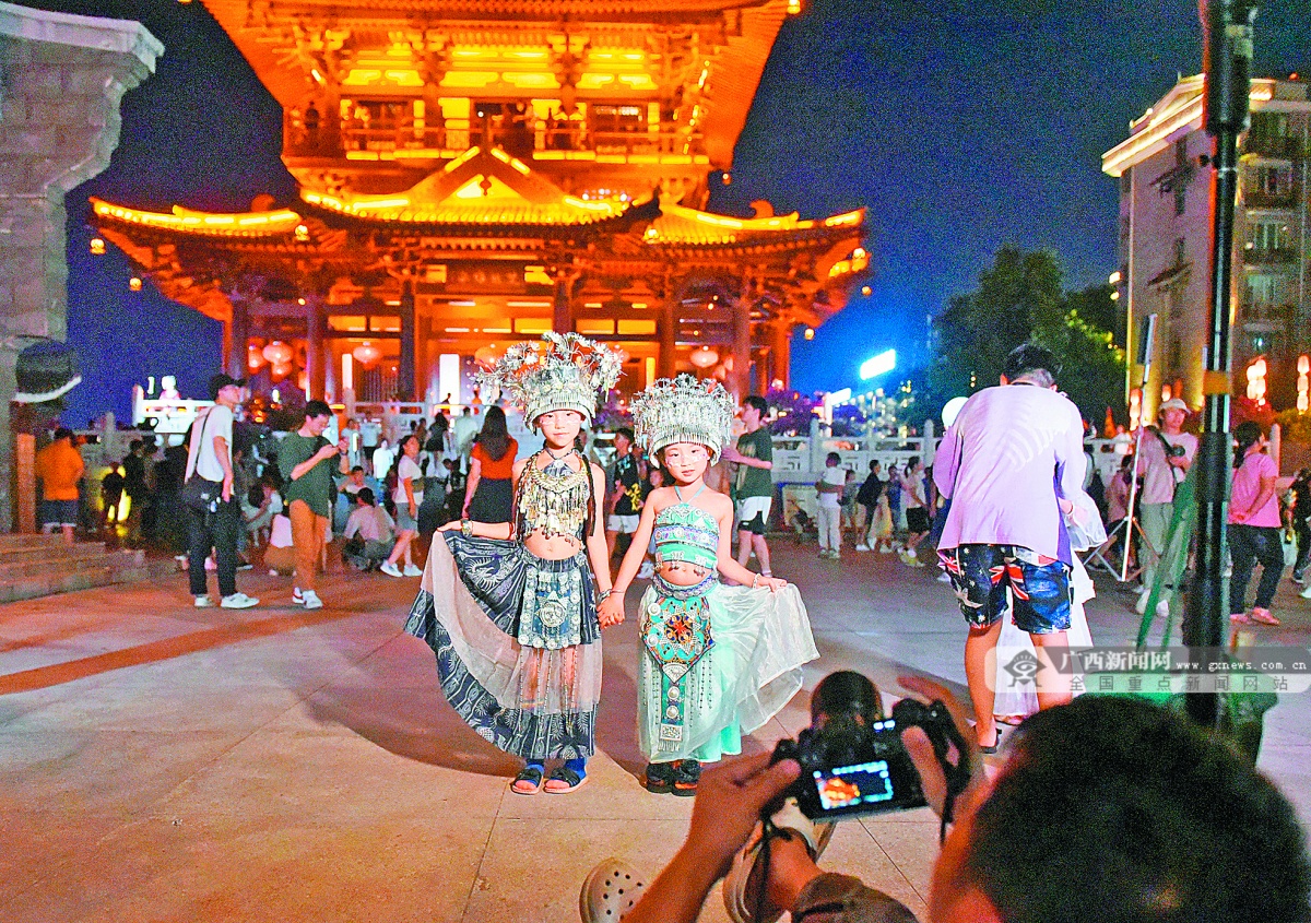 中秋國慶假期期間,到桂林市東西巷打卡,穿上美麗的民族服飾在古建筑前留影,成為外地游客爭相選擇的旅游項目之一。圖為10月2日,游客在東西巷歷史文化街區(qū)逍遙樓前拍照留念。黃捷文攝