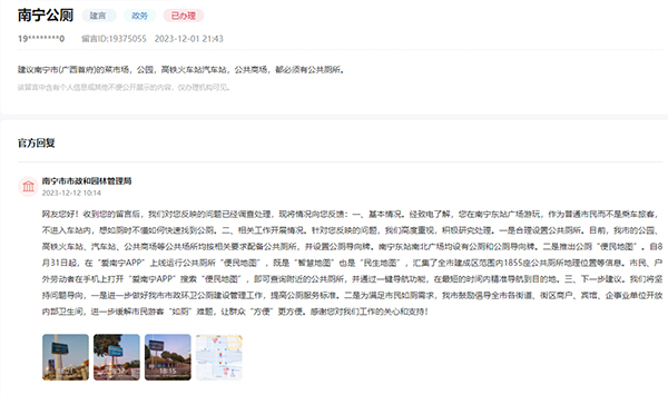 針對前述網(wǎng)友的留言,南寧市市政和園林管理局對此進行了回復(fù),表示會積極研究處理。