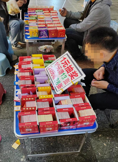 3月,有群眾舉報(bào),南寧市部分熱門商圈有人擺攤售賣“1元刮刮樂”的非法彩票。經(jīng)了解,這些非法彩票攤點(diǎn)確實(shí)分布廣泛,特別是在人流量大、正規(guī)即開型彩票銷售點(diǎn)密集的商業(yè)街上,緊挨正規(guī)的國家彩票銷售點(diǎn),試圖以假亂真、渾水摸魚。一元“刮刮樂”的小攤,簡易桌椅上擺著色彩鮮艷、標(biāo)價(jià)1塊錢1張、10塊錢13張、20元28張的所謂“刮刮樂”非法彩票。
