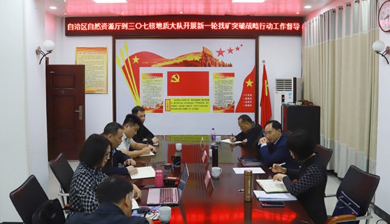 4月10日,自治區(qū)自然資源廳黨組成員、副廳長(zhǎng)黎修旦一行到廣西三〇七核地質(zhì)大隊(duì)就穩(wěn)步推進(jìn)新一輪找礦突破行動(dòng)工作開(kāi)展督導(dǎo)。