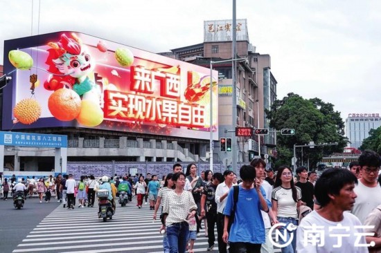 “來廣西實現(xiàn)水果自由”的宣傳片出現(xiàn)在中山路裸眼3D大屏上,鮮活生動。記者葉子榕攝