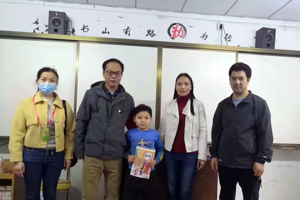 朱澤(左二)為少數(shù)民族群眾解決入學(xué)難題。銀海社區(qū)供圖
