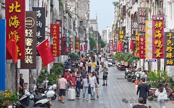 “我們一家昨晚就到北海了,先夜游僑港,今早過來老街和外沙島觀光,最大的感受就是北海濃厚的愛國氛圍,不論在哪個景點,都能看到愛國主義主題景觀?!眮碜詿熍_的游客徐先生說。