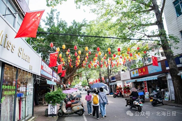 距離外沙島不遠處的北海老城景區(qū),百年老街的騎樓外墻上五星紅旗迎風(fēng)飄揚,部分通向海邊的小巷里也掛起了紅燈籠,街頭到街尾呈現(xiàn)一派喜慶景象。