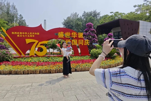 在銀灘景區(qū),處處布滿了“中國紅”,十分喜慶熱鬧。游客們迫不及待地拿著景區(qū)發(fā)放的小紅旗與大海、景區(qū)內(nèi)的建筑合影,鮮艷的五星紅旗在海風(fēng)的吹拂下格外亮眼。來自深圳的游客劉女士提前給孩子穿上小“軍裝”,打算用相機為孩子記錄下“北?!迸c“國慶”巧妙結(jié)合的童年瞬間,“穿著小‘軍裝’打卡北海我覺得很有意義,不僅是對新中國成立75周年的祝愿,也能在一定程度上培養(yǎng)孩子的愛國情懷?!眲⑴勘硎?。