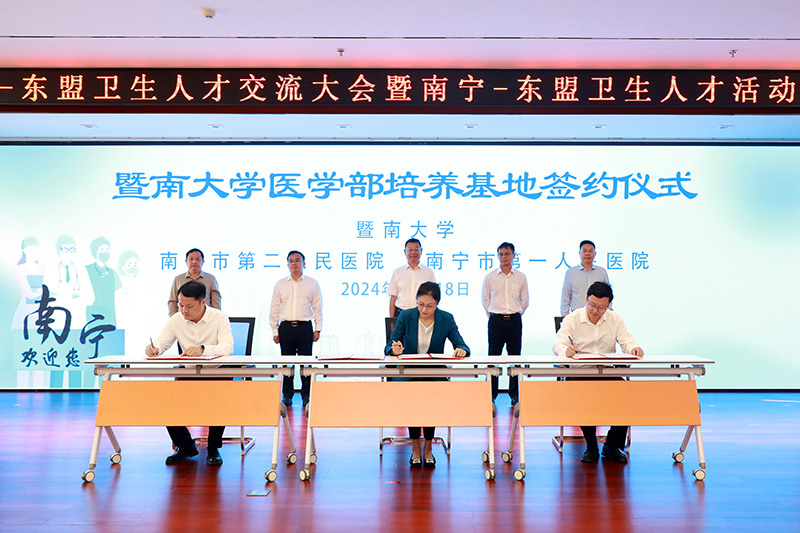閉幕式上,南寧市第一人民醫(yī)院、第二人民醫(yī)院作為“暨南大學醫(yī)學部醫(yī)學培養(yǎng)基地”完成簽約,在場各級領導共同為“暨南大學醫(yī)學培養(yǎng)基地”揭牌。近年來,南寧市衛(wèi)健委按照立足廣西打造粵港澳大灣區(qū)重要戰(zhàn)略腹地的部署要求,持續(xù)發(fā)力面向大灣區(qū)開放合作,雙向奔赴推動醫(yī)校協(xié)作走深走實。經過多次溝通交流、現場考察,最終與暨南大學達成醫(yī)學培養(yǎng)基地的協(xié)作意向,實現了市級醫(yī)療機構設立博士培養(yǎng)點的歷史突破。