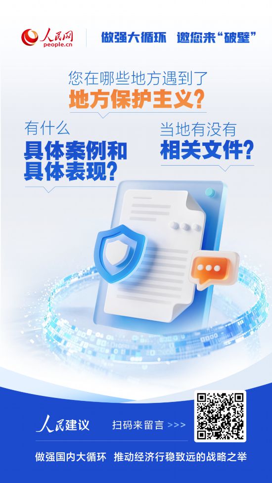 你遭遇過“地方保護(hù)主義”嗎?在哪些地方遇到的?具體情況和具體案例是什么?當(dāng)?shù)赜袥]有涉嫌“地方保護(hù)主義”的相關(guān)文件或者具體條款?人民網(wǎng)面向全社會開展“做強(qiáng)大循環(huán) 邀您來‘破壁’”意見建議征集,歡迎企業(yè)和社會各界人士掃碼留言。同時(shí)征集的問題和建議包括: