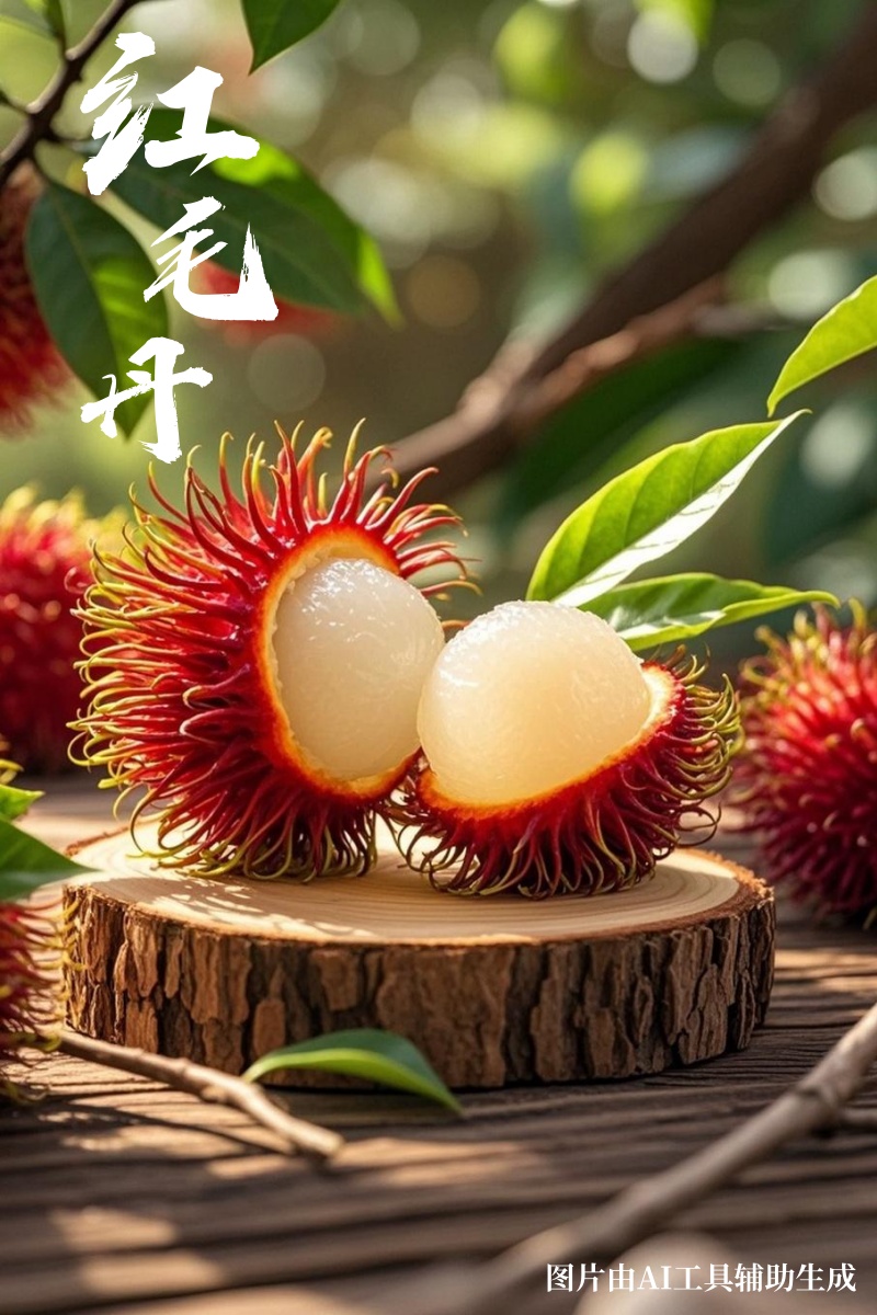 紅毛丹,又名毛荔枝、韶子、紅毛果,意為“毛絨絨之物”,主產(chǎn)于泰國(guó)、馬來(lái)西亞、印尼和菲律賓等東盟國(guó)家,其中泰國(guó)紅毛丹以果大味甜著稱。其果實(shí)呈圓形或橢圓形,外皮粗糙布滿紅色或黃色的柔軟毛刺,有著類似荔枝混合葡萄的香味,果肉晶瑩剔透,口感酸甜多汁。紅毛丹還富含維生素C和多種礦物質(zhì),既可直接鮮食,也能制成果汁或甜品,是夏日消暑的絕佳選擇。