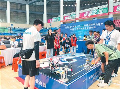 第二十二屆廣西青少年人工智能及機器人競賽暨跨區(qū)域面向東盟國家邀請賽現(xiàn)場,參賽選手正在調(diào)試機器人。本報記者 孫亞慧攝