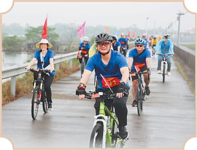 東興騎行愛好者張萬嬋早早報(bào)了名?!耙郧耙粋€(gè)人騎行看風(fēng)景,現(xiàn)在大家一起騎,更有氛圍。”她說,騎行隊(duì)伍進(jìn)入芒街,當(dāng)?shù)鼐用裆碇羵鹘y(tǒng)服飾,站在路邊熱情揮手歡迎。在騎行終點(diǎn)的芒街茶古廣場(chǎng),張萬嬋收到一枚象征友誼的紀(jì)念章。黃綠相間的紀(jì)念章上,刻畫著兩位騎手并肩前行的身影,背景是連通兩國(guó)的北侖河一橋。