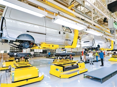 廣西汽車集團(tuán)五菱新能源公司整車裝配線運(yùn)用AI物流機(jī)器人運(yùn)送新能源電池。受訪者供圖