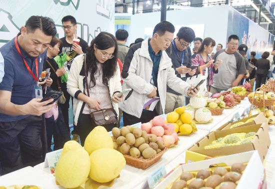 在2025年中國—東盟水果產業(yè)發(fā)展大會暨廣西水果產銷對接活動現場,色彩斑斕的廣西水果吸引觀眾拍照。記者劉增璇攝