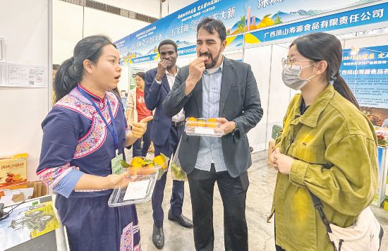 活動展廳內,艷紅的紅毛丹頂著蓬松柔軟的果刺,青黃相間的香水檸檬散發(fā)著清新氣味,紅白雙色的火龍果暈染出奇特撞色,金黃飽滿的桂紅蕉彎出誘人弧度……數十種廣西本土水果色彩斑斕,吸引觀眾駐足。試吃臺前,眾多觀眾邊吃邊夸贊“品相好、口感好”“甜而不膩,水分超足”,紛紛向果農詢問采購渠道。熱鬧的洽談聲與此起彼伏的贊嘆聲,讓現場充滿產銷兩旺的活力。