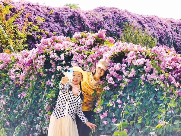 近日,南寧市花卉公園蒜香藤花開,眾多游客前來賞花拍照。記者宋延康攝