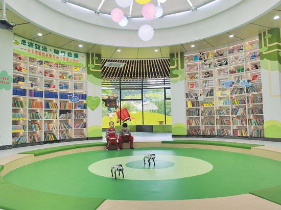 在該中心“螢火蟲書巢”里,陳列著來自深圳小朋友捐贈的愛心繪本,翻動書頁,仿佛能聽見兩個地域童心的共鳴?!爸窃旃し弧眱?nèi),親子互動其樂融融。最吸引眼球的是AI機器人和機器狗互動區(qū),科技之光在這里點亮了孩子們好奇的眼眸。